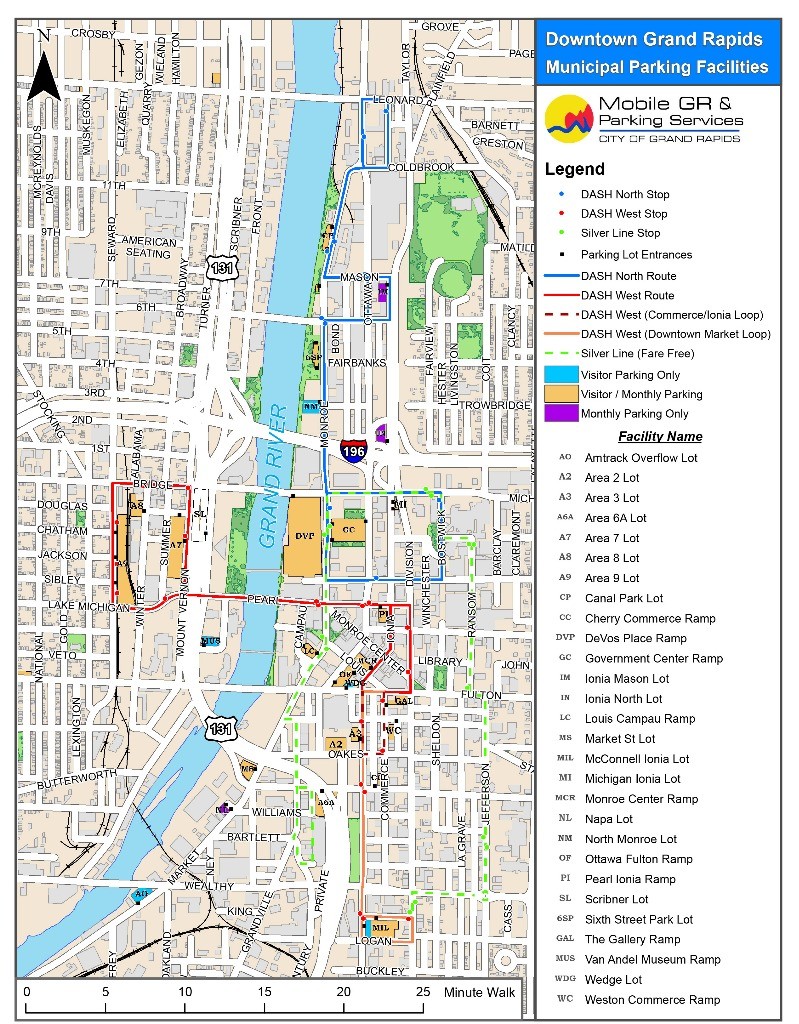 Parking facilities at DeVos Place are managed by the City of Grand Rapids. Metered parking is also available on the streets near the convention center.