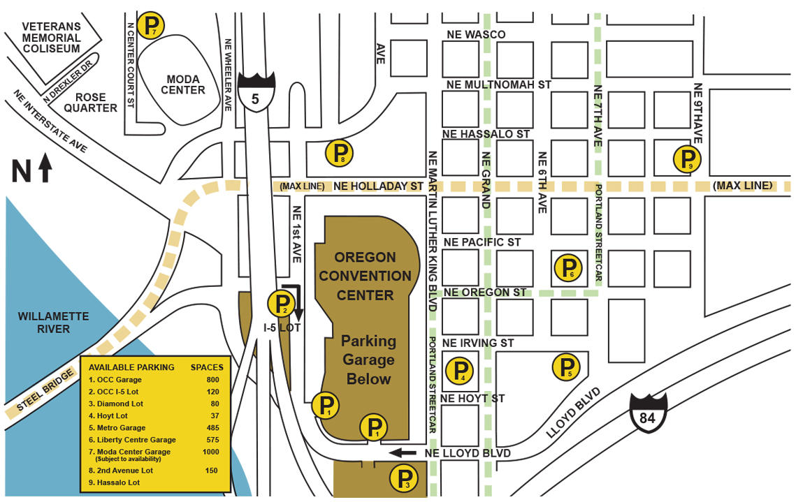 Enter the garage through either the Northeast First Avenue (P2) or Lloyd Boulevard (P1) entrance. Clearance on the P1 level is 7 feet; clearance on the P2 level is 9 feet.