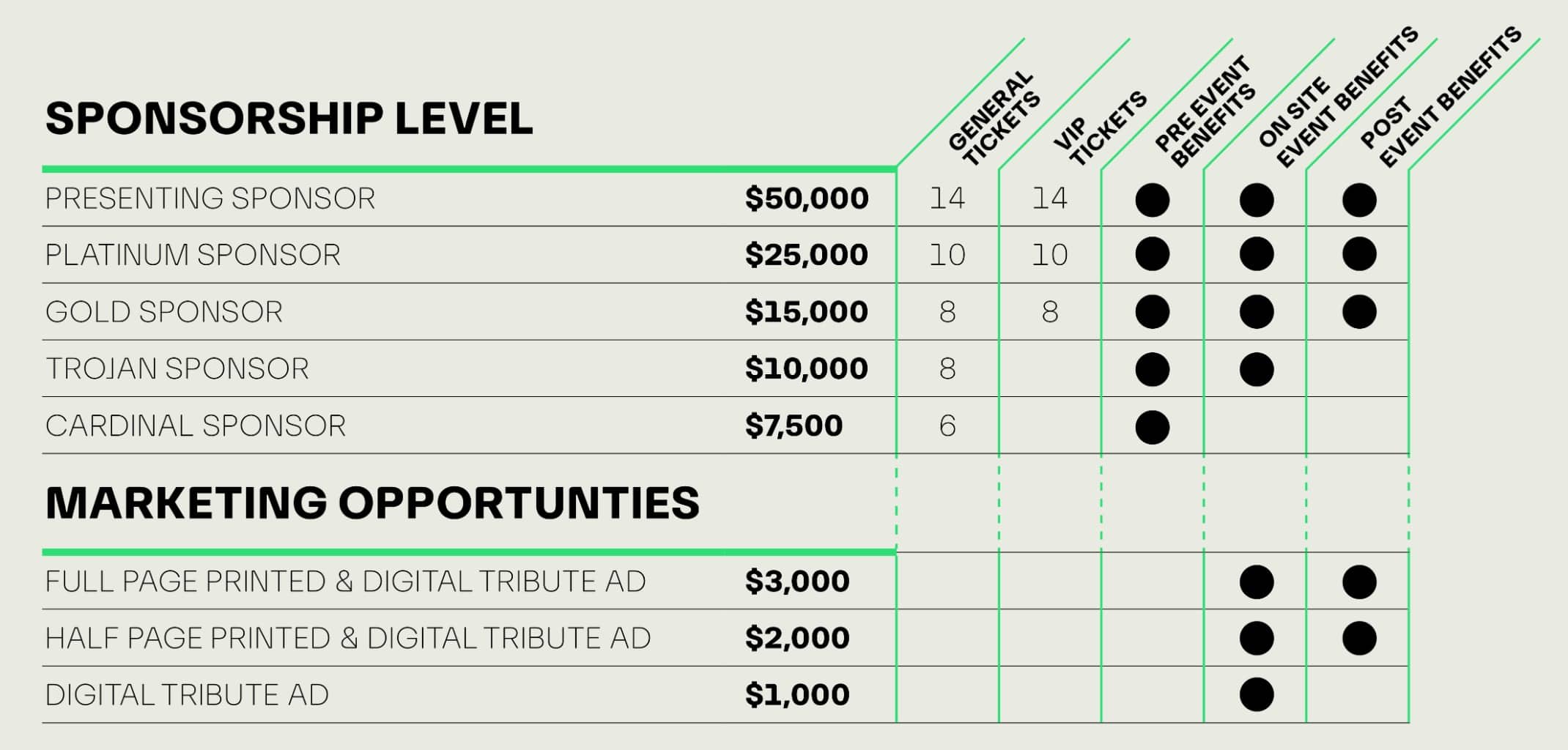 Presenting sponsorships are tax-deductible, less $3,500 cost for food/beverage.