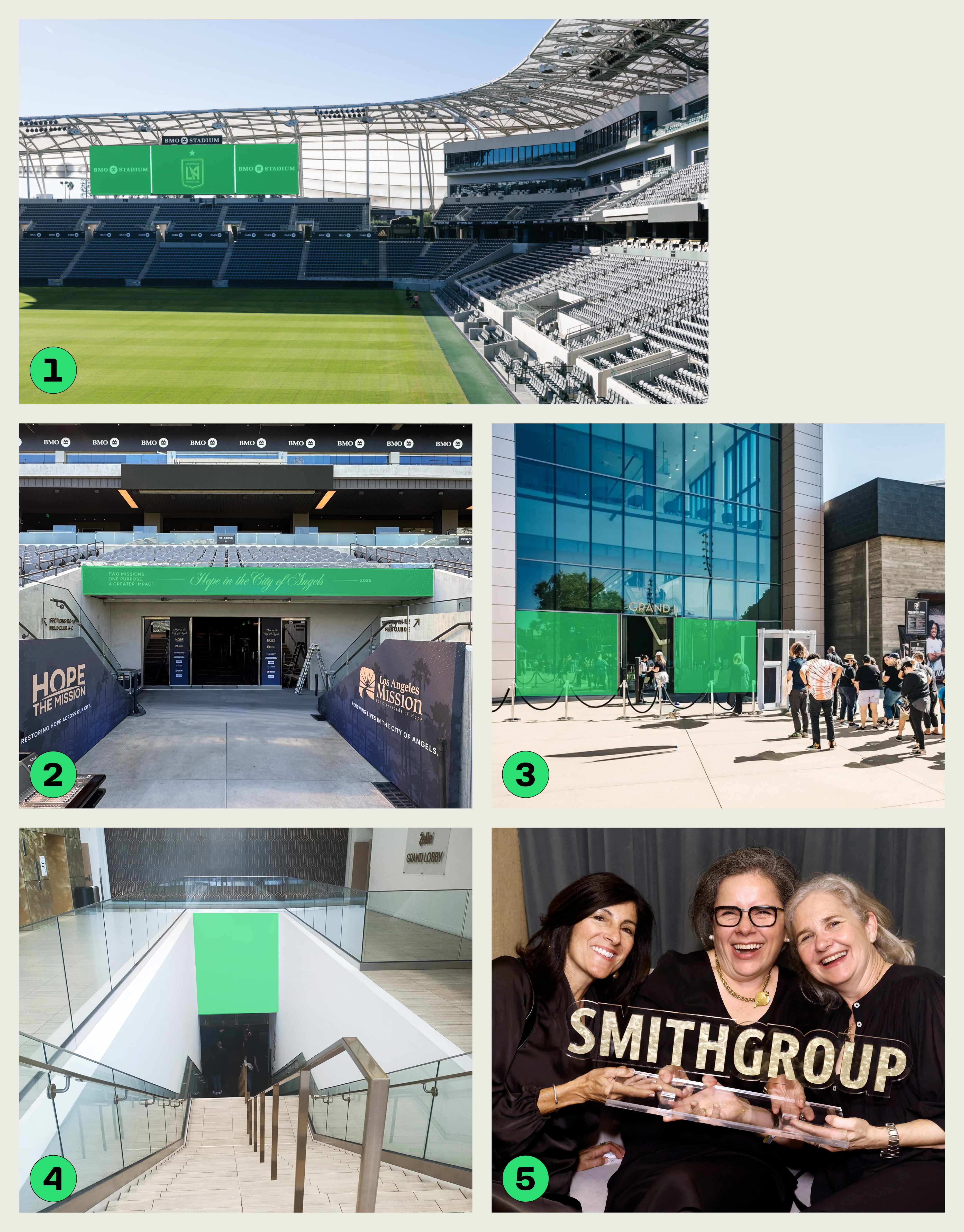 - Exterior and interior presented by recognition with logo on glass door entrance and above main entrance lobby stairs ③ + ④