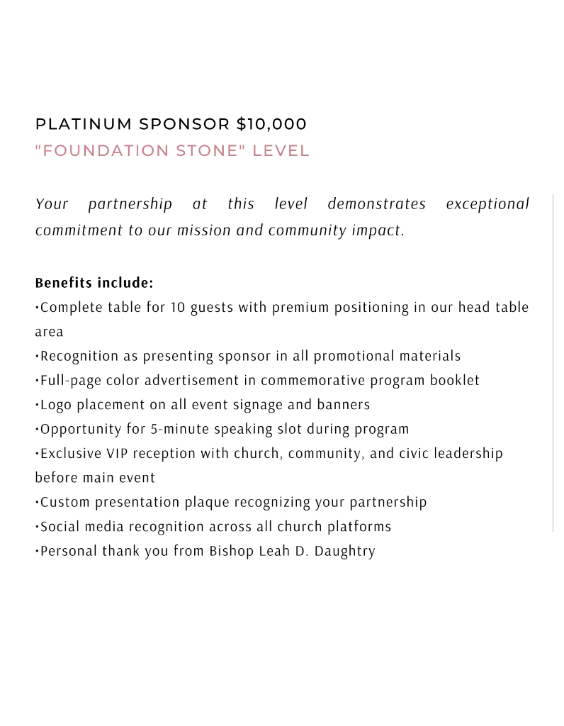 Thank you for considering a partnership with The House of the Lord Churches as we celebrate 95 years of faith, service, and community impact, along with Bishop Leah D. Daughtry's 5th anniversary as Presiding Prelate. Together, we can continue to be "doers of the word" and make a lasting difference in the lives of those we serve.