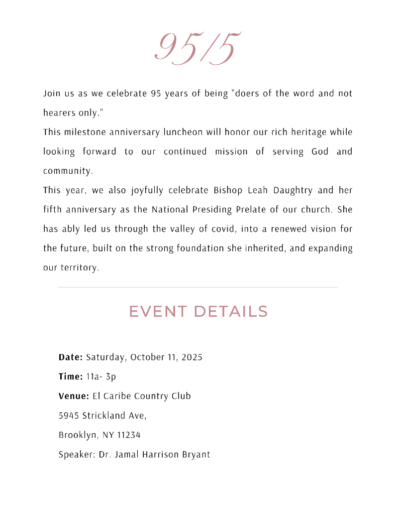 Special Note: This celebration also marks Bishop Leah D. Daughtry's 5th anniversary as Presiding Prelate.