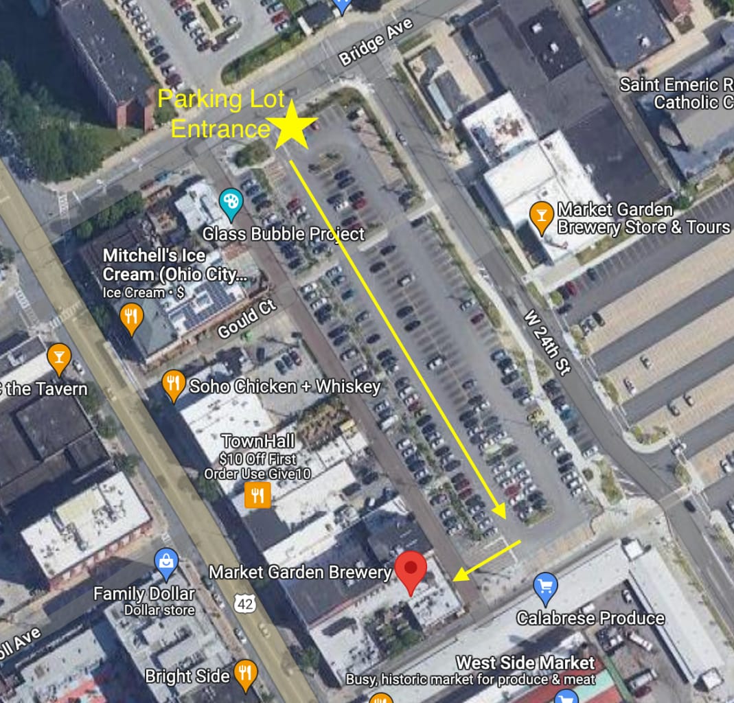 Parking Lot is located behind Market Garden Brewery. The parking entrance is on Bridge Ave, near the corner of Bridge Ave and West 24th St.