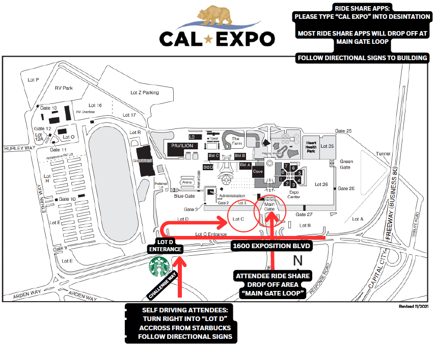 🚙 Ride Share: Type “Cal Expo” into the destination. Most ride share apps will drop off at the Main Gate Loop. Follow directional signs to Building 5.