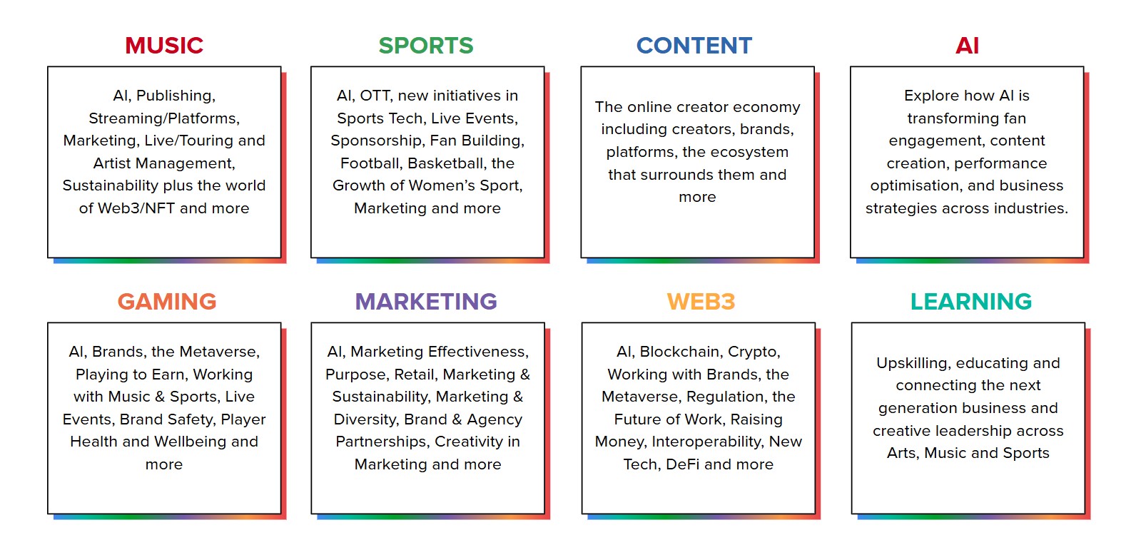 Our advisory board, a who's who of industry experts, helps us curate sessions that transcend traditional boundaries and cut through the noise. Expect in-depth discussions featuring industry leaders (and a few icons!) on the most pressing topics, including AI, content, and fan engagement. Here is an initial list of themes for discussion this year.